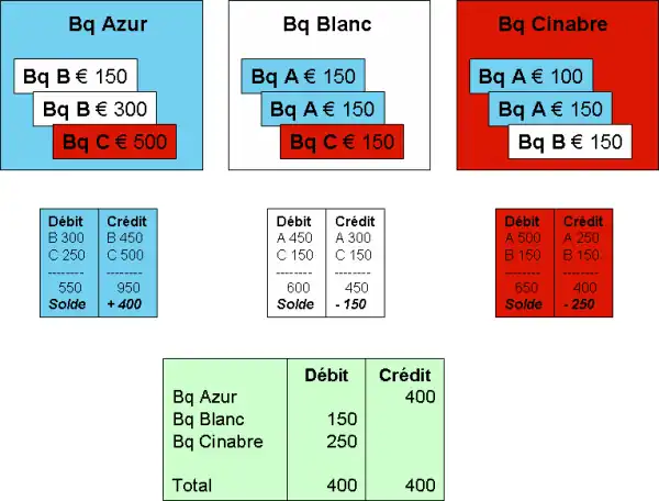 L'exemple repose sur un système interbancaire d'échange de chèques entre trois banques : Azur, Blanc et Cinabre. Ce système, après compensation multilatérale, se règle dans les livres d'un tiers, agent de règlement pour ce système.