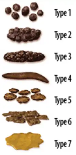 - Type 1 : Petites crottes dures et détachées, ressemblant à des noisettes (scybales[4]). Difficiles à évacuer.