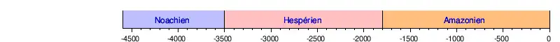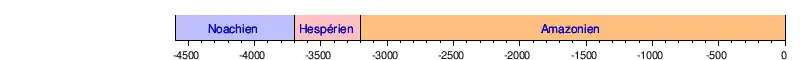 L'échelle des temps géologiques martiens élaborée par l'astronome américain William Hartmann remonte aux années 1970 et propose, à partir de la densité et de la morphologie des cratères sur les différents terrains de la planète, la chronologie suivante[2] (dates en millions d'années) :