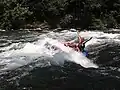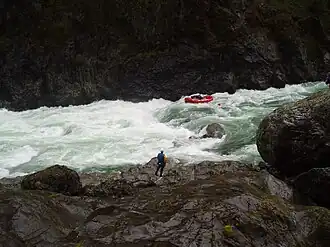 Rapides avec des vagues modérées et irrégulières qui peuvent être difficiles à éviter et qui peuvent submerger un canoë ouvert. Des manœuvres complexes en courant rapide et un bon contrôle du bateau dans les passages étroits ou autour des rebords sont souvent nécessaires; de grosses vagues ou des crépines peuvent être présentes mais sont facilement évitées. De forts tourbillons et de puissants effets de courant peuvent être présents, en particulier sur les rivières à fort débit. Le scoutisme est conseillé pour les groupes inexpérimentés. Les blessures en nageant sont rares; l'auto-sauvetage est généralement facile, mais une assistance de groupe peut être nécessaire pour éviter les longues nages. Les rapides qui se trouvent à l'extrémité inférieure ou supérieure de cette plage de difficulté sont respectivement désignés Classe III- ou Classe III +. | ![]() |