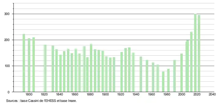 L'évolution du nombre d'habitants est connue à travers les recensements de la population effectués dans la commune depuis 1793. Pour les communes de moins de 10 000 habitants, une enquête de recensement portant sur toute la population est réalisée tous les cinq ans, les populations de référence des années intermédiaires étant quant à elles estimées par interpolation ou extrapolation[12]. Pour la commune, le premier recensement exhaustif entrant dans le cadre du nouveau dispositif a été réalisé en 2007[13].