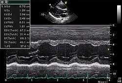 • On peut mesurer son volume, également en systole et en diastole : on somme le volume des disques successifs (de la pointe du cœur jusqu'à sa base) dont les diamètres sont estimés sur une coupe grand axe (Méthode de Simpson). En faisant le rapport (volume diastolique – volume systolique)/volume diastolique, on obtient la fraction d'éjection, indice important de la fonction contractile du muscle cardiaque.