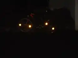 Vélo vu de nuit grâce par réflexion de l'éclairage des feux de la voiture sur les catadioptres.