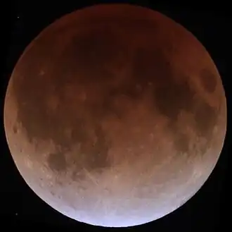 Lors d'une éclipse totale, les habitants des zones plongées dans la nuit peuvent observer les phénomènes suivants : une fois la Lune totalement éclipsée, les crépuscules terrestres se reflèteront sur la face visible de la Lune. La Lune apparaît alors avec des couleurs cuivrées, variant de l'orangé au rougeâtre. Puis la Lune finit par ressortir du cône d'ombre de la Terre, tout en reprenant sa couleur habituelle.