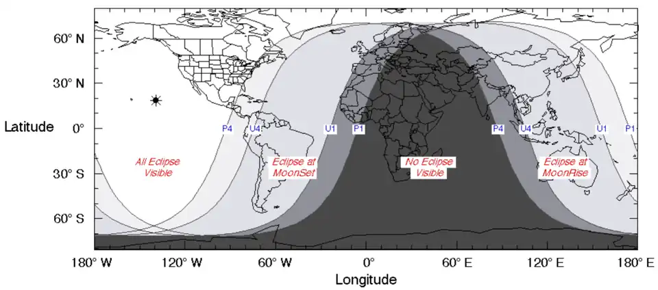 Cette éclipse est visible depuis l'Asie, l'Australie, l'Océanie, l'Amérique du Nord, et l'Amérique du Sud.