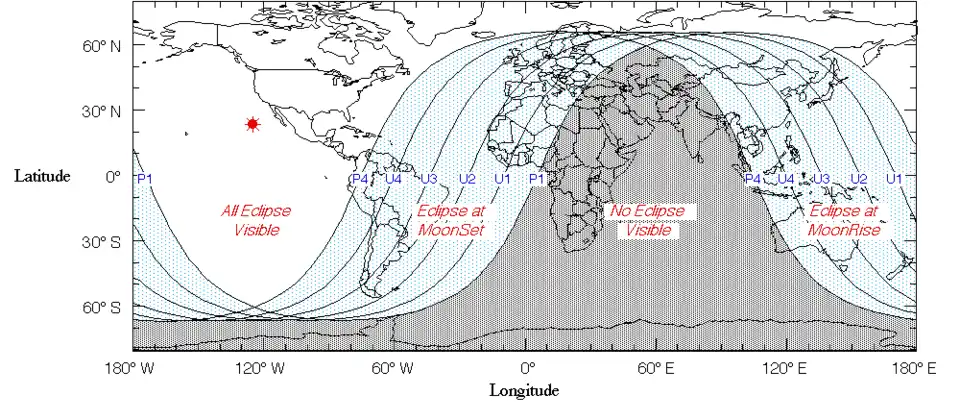 - le phénomène a été visible comme une éclipse lunaire totale en Amérique du Nord et du Sud, le de 5 h 29 à 11 h 4 (temps UTC), mais les observateurs de la côte ouest de l'Amérique du Sud n'ont pu en voir la fin, survenue après le coucher de la Lune.