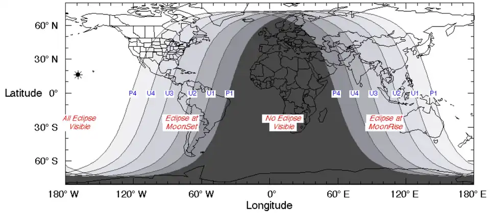 L'éclipse est entièrement visible depuis l'Océan Pacifique et la majeure partie de l'Amérique du Nord. Elle est visible au lever de la Lune depuis l'Australie, l'Asie et l’extrême Nord-Est de l'Europe, et au coucher de la Lune depuis l'Amérique du Sud et l'Est de l'Amérique du Nord.