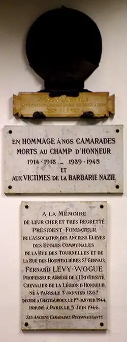 Sur le mur du fond de cette même halle se trouvent deux plaques commémoratives supplémentaires, l'une surmontée d'un médaillon à la gloire de Lyon Léopold (« À Lyon Léopold, instituteur à cette école de 1853 à 1900. Ses élèves »), l'autre à celle de Fernand Lévy-Wogue (« À la mémoire de leur cher et très regretté président-fondateur de l'Association des anciens élèves des écoles communales de la rue des Tournelles et de la rue des Hospitalières-Saint-Gervais, Fernand Lévy-Wogue, professeur agrégé de philosophie, chevalier de la Légion d'honneur. Né à Paris le , décédé à Châteauroux le , inhumé à Paris le . Ses anciens camarades reconnaissants »).