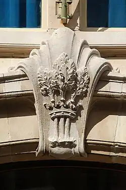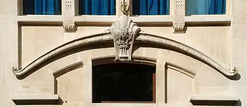 La façade du premier étage présente un ensemble de quatre grandes baies rectangulaires séparées par d'élégants motifs sculptés plutôt typiques de l'Art nouveau géométrique.