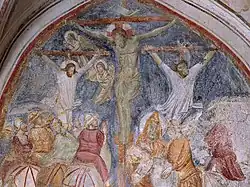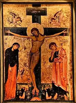 Le Christ crucifié entre la Vierge et saint Jean de la chapelle du Crucifix dans l'église San Domenico Maggiore (aujourd'hui dans le couvent) est l'une des premières attestations picturales de l'époque est, qui, selon la tradition, parlait à saint Thomas d'Aquin. Œuvre d'une grande conception et d'une élégance compositionnelle réalisée par un peintre inconnu et datant du troisième quart du XIIIe siècle, peut-être au début de la huitième décennie, elle présente les caractéristiques du byzantinisme local influencé par des exemples siciliens[5].