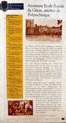 L'École royale du génie de Mézières fut fondée en 1748 sur proposition du comte d'Argenson, secrétaire d'État à la Guerre et de Nicolas de Chastillon, commandant de la citadelle de Charleville-Mézières. 542 ingénieurs militaires y furent formés.