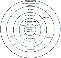- Le mésosystème : Ce système est composé de différents microsystèmes et constitue donc le réseau de connexions entre les environnements immédiats que représentent ces microsystèmes (par exemple, les relations qui se tissent entre la famille de l'enfant et l'école).
