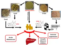 Schéma représentant les différents effets d'une contamination par des aflatoxines sur les consommateurs.