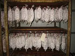 • La viande utilisée pour faire du saucisson (porc, bœuf, veau[6]...) contient naturellement une flore microbienne qu'il faut détruire pour garantir la qualité du produit. Pour cela, on peut procéder à des cycles de congélation/décongélation pour détruire certains microorganismes[7].