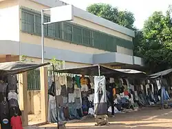 L'agence de banque commerciale est fermée par la crise politico-militaire. La façade extérieure sert de lieu de vente de friperie.