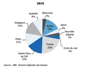 La Chine maintient sa place de premier client du territoire en 2019 en comptabilisant plus de 55% du total exporté, soit une part de marché multipliée par quatre en dix ans (13% en 2009). Les exportations vers la Chine sont d’une valeur de 99,7 milliards XPF (€830 millions).