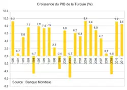 La Turquie, après de bons chiffres jusqu'en 2011 (+ 8,5 % en 2011 et + 9,1 % en 2010[13]) a connu un net infléchissement de son taux de croissance (+ 2,9 % en 2014)[23].