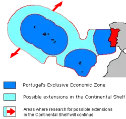 Parmi ses nombreux atouts, le Portugal possède aujourd'hui une gigantesque zone économique exclusive, qui s'étend sur plus de 1 720 000 km2 (soit plus de 18 fois sa superficie terrestre). Rapporté au niveau mondial, le pays, qui occupe la 111e place en superficie terrestre, possède la 11e plus grande zone d'exclusivité maritime du monde, devant l'Inde et la Chine. Celle-ci est en voie d'être agrandie au-delà des 350 miles actuels avec une demande effectué auprès de l’ONU en 2009, ce qui accroîtrait considérablement ses dimensions et créerait une ZEE continue entre le Portugal continental, les Açores et Madère[n 1].