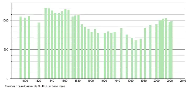 L'évolution du nombre d'habitants est connue à travers les recensements de la population effectués dans la commune depuis 1793. Pour les communes de moins de 10 000 habitants, une enquête de recensement portant sur toute la population est réalisée tous les cinq ans, les populations de référence des années intermédiaires étant quant à elles estimées par interpolation ou extrapolation[24]. Pour la commune, le premier recensement exhaustif entrant dans le cadre du nouveau dispositif a été réalisé en 2004[25].