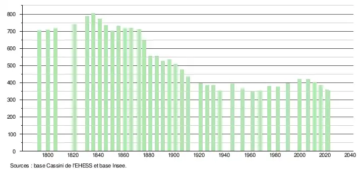 L'évolution du nombre d'habitants est connue à travers les recensements de la population effectués dans la commune depuis 1793. Pour les communes de moins de 10 000 habitants, une enquête de recensement portant sur toute la population est réalisée tous les cinq ans, les populations de référence des années intermédiaires étant quant à elles estimées par interpolation ou extrapolation[20]. Pour la commune, le premier recensement exhaustif entrant dans le cadre du nouveau dispositif a été réalisé en 2006[21].