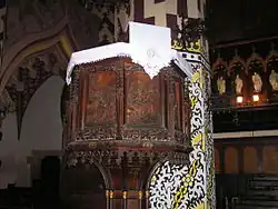 La chaire faite en bois et le baldaquin remontent au XIXe siècle, ils ont été faits dans le style néo-gothique sur un plan octogonal. En réalité, la chaire possède 5 côtés, décorés en reliefs, le socle et l’escalier en colimaҫon. Sur chaque côté il y a des reliefs avec les scènes du Nouveau Testament, des fragments de l’évangile, entre autres : Jésus enseignant de la barque, le Sermon sur la montagne, la conversation entre Jésus et une Samaritaine et l’expulsion des marchands du temple. Les reliefs ont été faits par le professeur Cirillo Dell’Antonio (1876-1971), en 1906 à Cieplice.