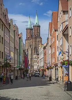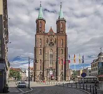 En conséquence d’une incendie du 25 mai 1338, l’église a été complétement brûlée. Entre 1362 et 1386, on l’a reconstruit et transformé à la basilique à trois nefs. Environ 1417, on a construit une chapelle double fondée par la guilde des drapiers. Entre 1450 et 1468, le curé et chanoine Martin Cromer a fait agrandir le bâtiment par la construction du chœur. Sous le règne de Frédéric Ier de Legnica, on a surhaussé la tour du côté sud en construisant le dôme octogonal avec la balustrade. Depuis ce moment-là, l’église avait deux tours de la hauteur et de la forme différentes.