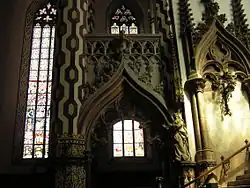 Le chœur a une forme proche du carré, à qui mène l’escalier de 10 marches. Les murs plus longues sont couverts de tracerie dans la forme des arcades. Entre les arcades, on peut voir la polychromie : la croix entrelacée de la couronne d’épines et les boutons de fleurs, probablement la rose de Luther.