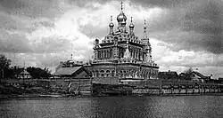 La première pierre a été posée le 12 juin 1894. La construction fut achevée le 2 août 1898. Le projet est dû aux architectes Alexander von Hohen et Alexander Ivanov[3], qui ont choisi un style néo-russe, et l'artiste Sergei Sadikov a peint les murs. À gauche de l'autel se trouvait une chapelle au nom du prophète Élie et de Saint-Nicolas. Une particularité du temple était les croix de verre installées sur ses dômes en 1896[3].