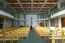 L'intérieur est dépouillé. L'autel et la croix symbolique sont éclairés le jour par un puits de lumière.