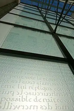 La façade, côté rue de la Roquette, est l'œuvre du verrier Guillaume Saalburg. Elle est composée de vingt-deux larges carrés de verre couverts d'écriture. Chaque élément est formé de trois couches de verre, dont celle intermédiaire en verre épais, légèrement teinté vert d'eau, est gravée de citations du Nouveau Testament. L'écriture est en mode boustrophédon, c'est-à-dire, qu'une ligne sur deux est lisible de l'extérieur de l'église, tandis que la ligne suivante l'est de l'intérieur. Les lettres elles-mêmes ont été créées par le calligraphe Frank Lalou[8]. De l'extérieur, les textes sont tirés des évangiles de Matthieu, Marc et Luc, tandis que de l'intérieur, on peut lire des parties de celui de Jean et des épîtres de Pierre.