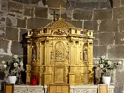- Le tabernacle architecturé de l'absidiole est en bois taillé entièrement doré, et date du XVIIe siècle. Il se présente sous la forme d'un édicule d'ordre corinthien, avec un corps central comportant le tabernacle proprement dit, et deux latérales en hémicycle en retour. La porte du tabernacle comporte un bas-relief représentant l'Agnus Dei sur le livre aux sept sceaux, entouré de nuées et de rayons de lumière. Des niches en plein cintre sont ménagées dans les ailes latérales, où des consoles arborant des têtes de chérubin supportent des statuettes de Saint Jean (à gauche) et de la Vierge de douleur (à droite). Les trois composantes de l'édicule sont cantonnées de pilastres, et supportent un entablement, qui, quant à lui, est couronné d'une balustrade à jour. Au-dessus du corps central, une tête de chérubin avec un collier d'ailes se profile sur le fronton en arc de cercle. L'ensemble est coiffé d'un dôme garni d'écailles, et sommé d'un crucifix. Le classement au titre objet remonte à 1914[46].