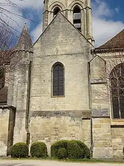 Les croisillons sont d'une architecture encore plus dépouillée tant à l'intérieur qu'à l'extérieur. Les clés de voûte ne sont pas sculptées, et les formerets font défaut, ce qui n'est du reste pas rare dans les croisillons de la première période gothique. Il n'y a ainsi qu'un seul chapiteau par angle. Il se caractérise par un haut tailloir, et est implanté à 45° face aux ogives, selon le parti le plus fréquent entre la fin de la période romane et le début de la période rayonnante. Il n'y a guère à dire de la sculpture, en grande partie abîmée, et certaines corbeilles sont du reste incomplètes. Les fûts sont tronqués dans de différentes mesures ; certains ont complètement disparu. Les arcades vers les bas-côtés et vers l'absidiole du croisillon nord sont en tiers-point, et pratiquement frustes. Elles ne sont pas moulurées, et sont à arêtes chanfreinées. La retombée s'effectue sur des tablettes biseautées engagées dans les piédroits. Tout ceci donne à penser que les pilastres à l'est des bas-côtés sont bien dans l'esprit des croisillons, et datent donc d'origine, même si les tailloirs et chapiteaux ont dû être remaniés. Les ogives sont monotoriques, comme dans les deux dernières travées des bas-côtés. Elles retombent sur des chapiteaux à hauts tailloirs implantés à 45° face aux ogives. dont les fûts ont été tronqués. Les fenêtres sont sans décoration. Chacune des deux extrémités du transept est ajourée d'une grande baie en tiers-point, qui est entourée d'un faible ressaut. La face occidentale du croisillon sud comporte une baie semblable, mais en cintre brisée, et la face occidentale du croisillon nord seulement un oculus. Une fenêtre bouchée est visible en face à l'est. On peut évoquer, dans le contexte du croisillon nord, l'absidiole qui s'ouvre dans son mur oriental. Son intérieur extrêmement dépouillé produit une impression de froideur. Son voûtement d'arêtes, peu compatible avec un chevet en hémicycle, peut surprendre. Ses deux fenêtres géminées sont en plein cintre, et s'ouvrent au-dessus d'un long glacis pentu. Elles sont surmontées d'archivoltes toriques retombant sur des impostes profilés d'une plate-bande et d'un cavet. L'absidiole est considérée unanimement par tous les auteurs comme la partie la plus ancienne de l'église, mais la datation est moins évidente. Maryse Bideault et Claudine Lautier penchent pour le début du XIIe siècle, en raison de son archaïsme, ce qui pose le problème de l'explication du grand délai qui se serait écoulé jusqu'à la mise en chantier du transept. Après réflexion, Louis Régnier explique l'archaïsme par un parti pris d'économie, qui caractérise également les croisillons et les travées orientales des bas-côtés. Aucun élément concret ne renvoie en réalité à la première moitié du XIIe siècle[24],[27],[28],[29]. Des absidioles contemporaines également très archaïques se trouvent à Choisy-au-Bac. Les absidioles ne tombent pas directement en désuétude à la période gothique, comme le soulignent Champagne-sur-Oise, Fosses, Luzarches, Saint-Vaast-de-Longmont.