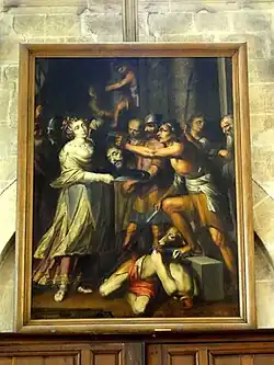- Le tableau peint en huile sur toile et représentant la décollation de saint Jean-Baptiste, mesure 180 cm de hauteur pour 155 cm de largeur, cadre compris. Non signé et non daté, c'est incontestablement l'œuvre d'un maître, qui semble faire partie des peintres caravagesques du début du XVIIe siècle. Il pourrait s'agir de Louis Finson (1578-1617), qui s'est justement formé en Italie du vivant du Caravage. L'on sait aussi qu'il fit un bref séjour à Paris vers 1615, avant de s'installer définitivement aux Pays-Bas. De cette époque pourrait dater le présent tableau, qui serait alors l'un des chefs-d'œuvre du peintre flamand. Caractéristiques de son style sont l'intensité des clairs-obscurs avec des effets de projeteur, la densité de la composition et le cadrage serré. À gauche, Salomé, d'une beauté presque irréelle et d'un regard parfaitement indifférent, tend un plat, sur lequel le bourreau, visible à droite, s'apprête à poser la tête du précurseur. Les yeux pas entièrement fermés, elle est chargée d'une expression réaliste. Sa physionomie avenante contraste avec les traits plutôt disgracieux des autres hommes présents. Le corps sans vie gît, recourbé, par terre, les mains liées. À côté, la signification du veau dont l'on aperçoit la tête reste à clarifier. L'œuvre est classée depuis 1988[54].