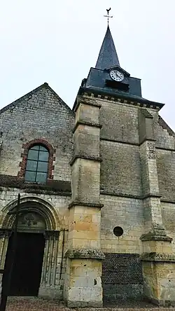 Construit en brique et pierre, l'édifice conserve des éléments d'architecture romane dans le clocher et notamment dans le pignon de l'abside où l'on peut voir des modillons sculptés[4]. Le portail sud de l'édifice est de l'époque Renaissance[1].