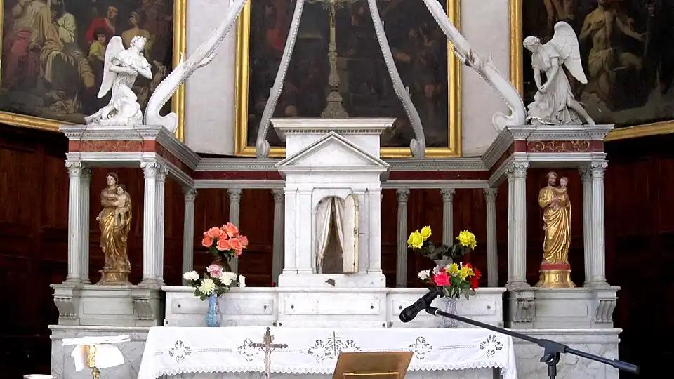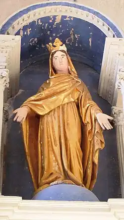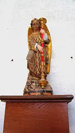 - une importante statuaire en bois polychrome du XVIIe siècle : une Vierge[5], sainte Cécile[6], saint Jean-Baptiste[7] et deux anges porte-candélabre[8] ;