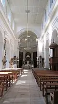 La nef, très lumineuse avec voûte en berceau, est flanquée de deux collatéraux éclairés par des baies vitrées se terminant sur deux chapelles latérales consacrées respectivement à la Vierge et à saint Quentin, second patron de la paroisse. Le chœur est éclairé par une coupole byzantine.