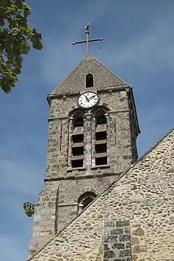 Sur le côté méridional, au niveau de la quatrième travée, se dresse la tour-clocher, de plan carré et couverte d'un toit à double pente. Elle est percée de baies abat-son en plein cintre sur deux niveaux. Le clocher qui date de la fin du XIe siècle ou du début du XIIe siècle et le chœur, de deux travées et à chevet plat, qui date de la fin du XIIe siècle, sont les parties les plus anciennes qui formaient la première église.