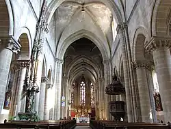La nef, croisées de voûtes, alternance de piliers et colonnes.