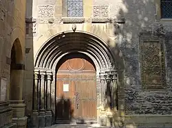 Les parties les plus anciennes de l'édifice datent du XIe siècle, on ne dispose pas de plus d'informations sur l'église primitive. Il s'agit d'éléments de style roman : les bras du transept dont les hautes absides semi-cylindriques caractéristiques sont visibles aussi bien à l'intérieur de l'église que de l'extérieur où elles sont décorées de lésènes, frises caractéristiques de l'art roman. Le portail de l'entrée sud avec sa remarquable archivolte en plein-cintre fait partie de ces éléments les plus anciens, de même que les bas-reliefs qui le surmontent.