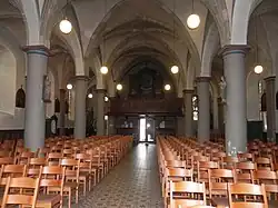 Les lambris actuels qui ornent les murs intérieurs de l’église furent placés au début du XXe siècle avec les anciens confessionnaux. À cette époque, on plaça aussi un nouveau pavement sur l’ancien. Le niveau du sol s’éleva de quelques centimètres ce qui eut pour conséquence la condamnation d’un degré de l’escalier du chœur, ramenant de trois à deux le nombre de marches[8]. En 1910 eut lieu l’agrandissement du jubé. De nouvelles colonnes en fonte et des poutrelles en fer furent placées pour le supporter. L’ancien plancher fut aussi remplacé par un nouveau en chêne.