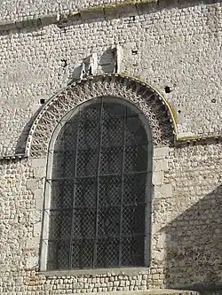 Les contreforts ont été en grande partie refaits lors d'une restauration. Au niveau de leur sommet, un second cordon de billettes anime la façade. Il s'infléchit au-dessus de la fenêtre occidentale de la nef, qui mesure 3,00 m de large, alors que les fenêtres latérales de la nef ne mesurent que 2,07 m de large. Il n'y a pas d'ébrasement. La décoration des claveaux de l'archivolte est extraordinaire, et se compose de formes géométriques simples mises en relief par l'excavation des espaces comprises entre les lignes. Un premier rang de claveaux est de faible envergure, et comporte des pierres dont la partie supérieure est triangulaire. Ces pierres montrent des losanges subdivisés par une ligne horizontale. Le premier rang de claveaux, également de faible envergure, est constitué de pierres carrées disposées en losange, et le décor est ici formé par deux lignes entrecroisées reliant les extrémités du losange. Le troisième rang de claveaux est plus important que les deux premiers réunis, et chaque pierre peut ainsi comporter deux croix superposées et un triangle, ce dernier s'insérant entre deux losanges du second rang de claveaux. Ce type de décor géométrique apparaît parfois sur les impostes des grandes arcades à partir du milieu du XIe siècle, comme à Cinqueux et Rhuis. S'ajoutent à ce décor, trois personnages nus de taille inégale et répartis irrégulièrement, prenant place tous les trois sur le rang de billettes au-dessus de l'archivolte. Eugène Woillez a démontré que ces personnages ont été réencastrés, et ils pourraient donc provenir de l'ancienne façade. Quant aux piédroits de la fenêtre, elles sont formés par des pierres de moyen appareil, comme par ailleurs ceux du portail occidental, qui se résume à une porte en plein cintre sans décoration aucune. Les murs occidentaux des bas-côtés sont aveugles, et aux angles, apparaissent des contreforts apparemment refaits[22],[23].