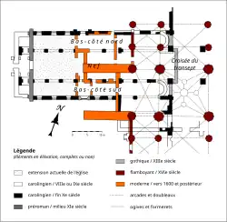Primitivement, la nef était précédée d'un massif occidental servant de porche. La faible profondeur ne parle pas en faveur d'une tour, dont le premier étage aurait pu s'ouvrir sur la nef à l'instar d'une tribune, comme à Morienval. La nef était trois fois plus longue et comptait neuf travées. Pour imaginer cette longueur, il faut ajouter la moitié de leur longueur au bas-côté sud, la partie servant de couloir comprise. Le transept était largement débordant, comme toujours à l'église Saint-Étienne de Beauvais, et chaque croisillon comportait deux parties successives. La croisée du transept était sans doute surmontée d'une tour-lanterne, comme fréquemment à l'époque carolingienne : son plafond était donc située plus haut que celui de la nef, et des fenêtres hautes, situées dans les angles, laissaient entrer le jour. Seul le croisillon sud a été presque entièrement fouillé, et l'on sait qu'un portail protégé par un porche se trouvait à son extrémité méridionale. Dans l'angle entre la septième à la neuvième travée du bas-côté sud et du croisillon, se trouvait une chapelle qui comportait deux vaisseaux parallèles, avec deux toits en bâtière indépendants dans le sens longitudinal (est-ouest). Au nord, il y avait une construction semblable, mais elle n'a pas pu être entièrement reconnue. Le chœur, dont l'on ignore toujours le plan exact, était flanqué de deux absidioles. La longueur totale de l'église était de 65 m environ, et la largeur est de 20,60 m au niveau de la nef. Tenant compte du niveau primitif du sol, la hauteur de la nef devait être de 19 m[19],[20].