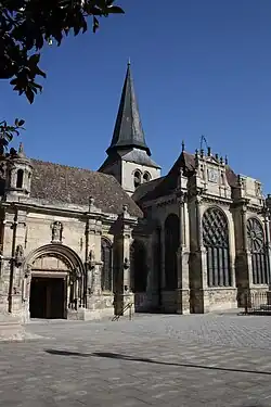 La façade commune de la seconde travée du croisillon sud et de la chapelle de la Vierge donne une image de générosité grâce aux deux vastes baies qui les éclairent. Comme déjà évoqué, il s'agit de baies à cinq formes, ce qui est assez rare. L'on peut saluer qu'une rupture de style avec le bas-côté sud, construit pourtant une quarantaine d'années plus tôt, a été évitée. Le remplage des fenêtres reprend l'esprit du bas-côté sud, où le motif des losanges se trouve déjà. La rosace est quant à elle une forme répandue à l'époque gothique, avec toutefois des réseaux plus élaborés. Deux contreforts orthogonaux se situent à chacun des deux angles de la façade, et un autre se trouve à l'intersection entre les deux travées. Ces contreforts sont agrémentés de colonnes corinthiennes, qui ne commencent qu'à mi-hauteur. Ces contreforts soutiennent un entablement, dont la corniche est agrémentée d'olives et de perles, et dont l'architrave est décorée de grecques, au-dessus d'une succession de consoles et de visages. Au-dessus des contreforts, les architraves arborent en outre des têtes de lion. La corniche supporte une balustrade aveugle, qui cède la place à des attiques avec frontons (celui de droite ayant disparu) au milieu de chacune des deux travées. Les attiques sont amortis par des ailerons et scandés verticalement par des pilastres corinthiens, qui encadrent respectivement une horloge et un cadran solaire au centre, ainsi que des niches à statues aux extrémités. Un vase se dresse au-dessus de chacun des pilastres corinthiens. À en juger par la sobriété de l'abside, la façade gothique flamboyant qui a été démolie pour laisser la place à ces deux travées du début du XVIe siècle devait être sans grand intérêt. L'abside ne se remarque que par ses pinacles à crochets qui amortissent ses contreforts à quatre larmiers intermédiaires, ainsi que par une corniche assez intéressante qui se limite toutefois au mur sud du chœur et au pan sud-est de l'abside. Elle comporte des monstres, des personnages et des éléments végétaux dans le style de l'art flamboyant. Les mêmes pinacles que sur l'abside terminent les contreforts du collatéral nord du chœur. Bien que non visible depuis le domaine public, l'élévation nord n'est pas dépourvue d'ornementation, mais elle reste plus sommaire et évoque ainsi la froideur du style classique à venir[28].