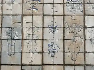 La façade du porche figurent une pagode chinoise à trois toits superposés couverts de tuiles creuses décorée d'idéogrammes chinois empruntés aux litanies de la vierge et à l’art d’extrême orient. Le décor de grès vernissé est conçu par Raymond Virac, revenu d’Hanoï où il était professeur, assisté par Mlle Lorimy, exécuté par Robert Barriot[18].