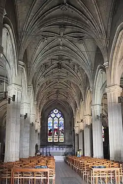 L’église est de style gothique rayonnant. Les chapiteaux sont décorés de feuillage, d’animaux et de symboles chrétiens. Les branches des voûtes à liernes et tiercerons retombent en pénétration dans le pilier