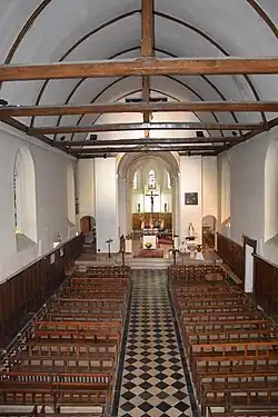 Construite en pierre sur un plan basilical et couverte de tuiles, l'église est surmontée d'un clocher quadrangulaire couvert d'ardoises à la croisée du transept et de la nef.