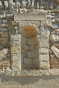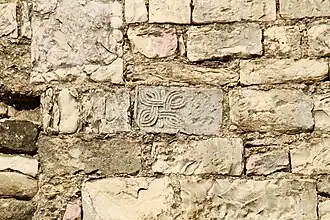 On y trouve, insérée dans la maçonnerie une pierre bleutée sculptée fort ancienne, connue sous le nom d'« entrelacs quadrilobé à trois brins », qui serait peut-être d'époque carolingienne[3],[4]. Cette pierre, martelée sur sa moitié droite, présente sur sa moitié gauche un entrelacs comportant quatre volutes composées de trois brins ainsi que trois petites boucles à un seul brin[5].
