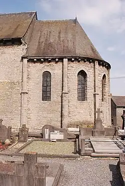 L'église est construite en pierre calcaire sous une toiture en ardoises. L'édifice possède une seule nef de quatre travées avec baies placées en partie supérieure au-dessus d'un bandeau de pierre de taille. L'abside semi-circulaire, plus basse que la nef, est placée côté rue. Cette abside du XIIIe siècle est un remarquable et rare témoignage d’architecture gothique en région rurale de cette époque. Elle est divisée en sept parties matérialisées par autant de baies à vitraux séparées par des pierres de taille en pilastres. Il est à noter que les deux baies les plus proches de la nef sont plus récentes (XVIIIe siècle) et forment des arcs en plein cintre alors que les autres baies médiévales sont constituées d'arcs brisés. La façade possède une porte d'entrée cintrée, un oculus ainsi qu'un clocheton carré placé un peu en retrait et surmonté d'une croix et d'un coq en girouette[1].