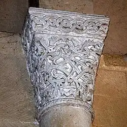 Sur chacune des petites faces de la corbeille on voit un homme sur le dos d'un lion. La face principale et le tailloir du chapiteau foisonnent avec des rinceaux et lianes qui couvrent tout l'espace disponible.
