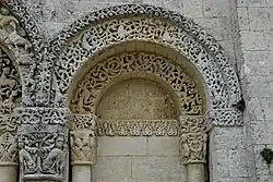 La voussure externe du portail central s'appuie sur des hauts chapiteaux historiés reposant sur des colonnes courtes et larges contrastant avec les colonnettes voisines.